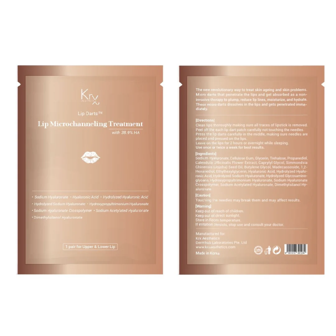 KrX Lip Darts — это процедура микроперфорации для губ. Каждый патч содержит активные ингредиенты, которые находятся в растворимых стрелках. При нанесении на губы стрелки, напоминающие микропипетки, создают микроканалы, что увеличивает абсорбцию активных компонентов.